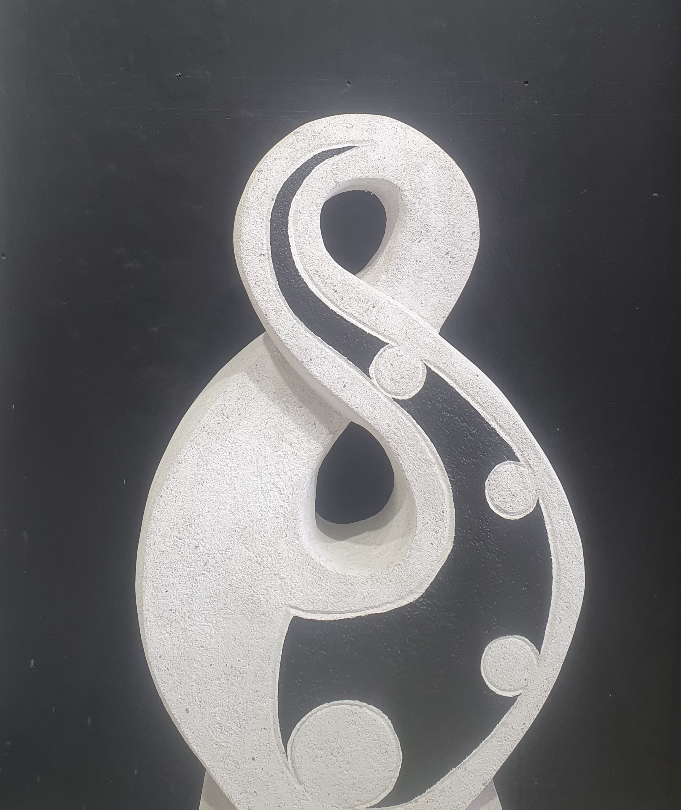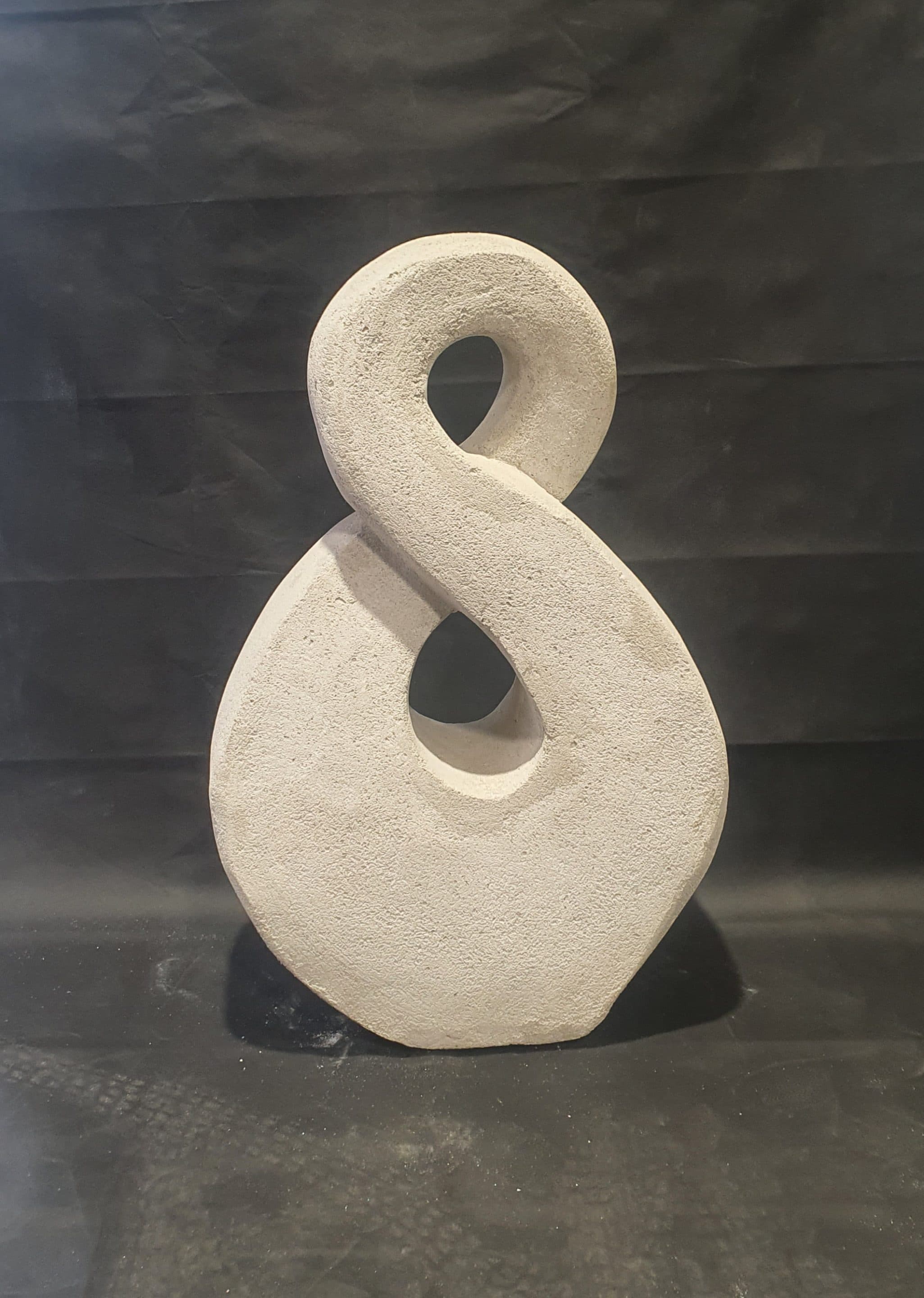 Large Infinity Twist, stands 1200mm H x 300mm W x 700mm D, made from recyclable materials. Each piece is fully handmade and will look slightly different form the next. Finished in white concrete and come with a black insert (painted in outdoor paint). This is the actual piece. Finished weight around 20kgs